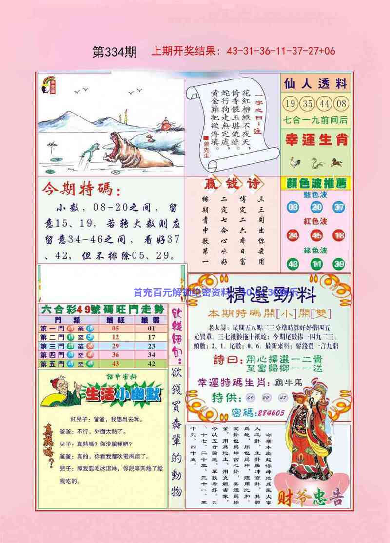 | 334期:【一字記曰】《悠》 消遥自在,悠然自得;云头红上三竿日。 自成一角,懶理得失!戴胜谷谷催春耕。 玄机测字:《祥》 解:云头红上三竿日:三竿日解日肖兔龙蛇马羊猴 综合取肖:兔龙蛇马羊猴 |