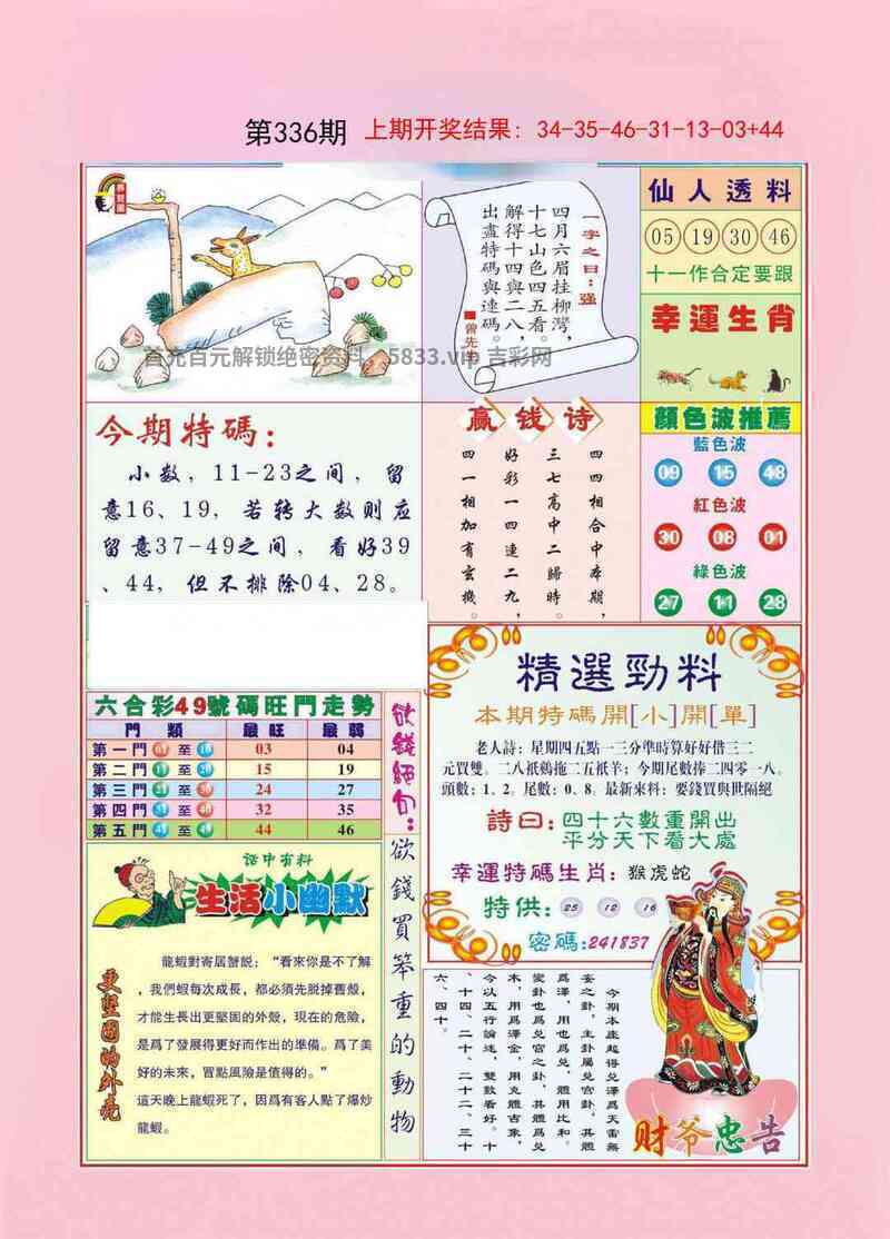 | 337期:三行中特【火木金】开:鸡09中 |